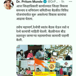 Hon Pritam gopinath munde(Khade)(Bajgire)Ji,Present in today Beed Collector Hon Aribam Radhabinod Sharma ji,in the office District Development Coordination and Monitoring committee In the meeting has reviewed various plan through continuetion development works,as well as Highway,railway has taken meeting separate,Roads and railway has Taken information from their work,After the meeting Beed From the urban has survey for going highway work...Namdev Kishan Bajgire