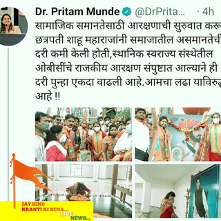 Hon Pritam Gopinath Munde(palwe)(Bajgire) Ji, Present in Social reservations for By starting was been reduced Chhatrapati shahu jaisingh(Ghatge)Bhosle Ji,The gap of equality in socieal,sthanik swarajya sanstha in OBC With the end of political reservation Has increased This valley Once again,Ours is Fight again...