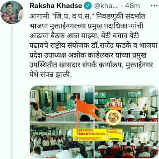 Hon Raksha Nikhil Khadse(Bajgire)Ji,Present in front coming Zilla Parishad and Panchayat Samiti election about has done BJP Muktinagar bearer review meeting with 'Beti Bachav,'Beti Padhav, National Convener Hon Dr Rajendra Phadke Ji,and BJP State Vice President Hon Ashok Kandelkar Ji,in the present at the Muktinagar here contact office Member of Parliament Raver...Namdev Kishan Bajgire