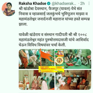 Hon Raksha Nikhil Khadse(Bajgire)Ji,Present in Shri Khandoba Shrine faijpur(Yaval)here Saint Residence and Mhalsai of the Aquarius has Done hand with saint Mahamandleshwar janardhan Ji,Khanderay and sansthan Gadipati Shri Shri 1008 Mahamandaleshwar Mahant Purushottamdas Ji,has interacted on various subject With blessing...
