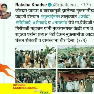 Hon Raksha Nikhil Khadse (Bajgire) Ji,Survey in Raver with Hon Devendra Gangadhar Fadanvis Ji,Hon Girish Dattatray Mahajan Ji,in this Day 1/6/2021,Area at Unchda,Mendholade,Shemlade&Naygaon,Nomber of Village lost Resistance home&farmers Banana Crop have been Lost their caused by Rains&Storm,Govt of India Decide on his daister,gave patience for Home&Banana crop lost farmer...